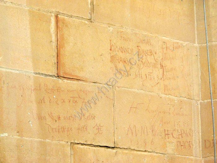 historické nápisy na stěně vnějšího pláště kaple Zápolských