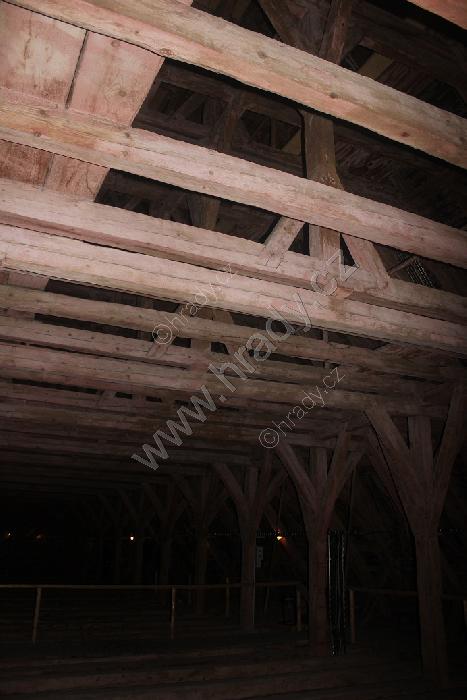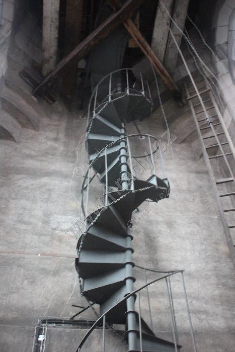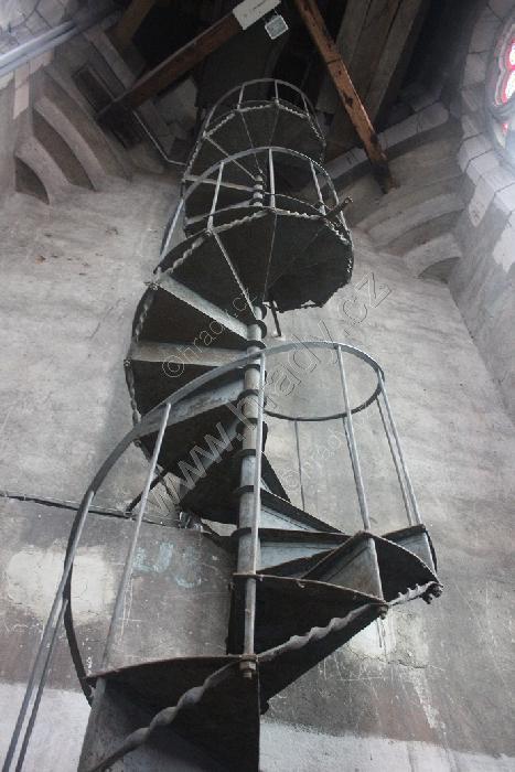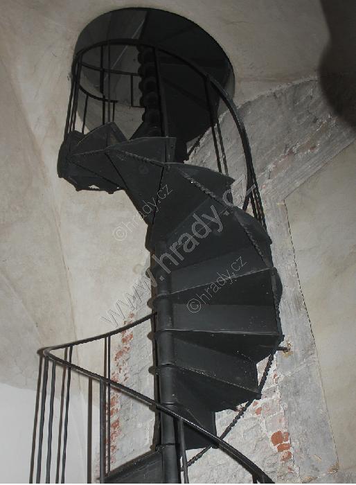 Schodiště ve spodní části věže v průčelí a za nimi zachovalé románské zdivo.