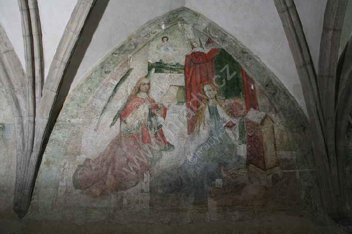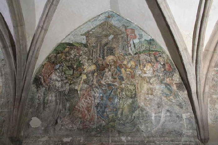 Gotická malba Klanění tří králů v jižním ramenu ambitu