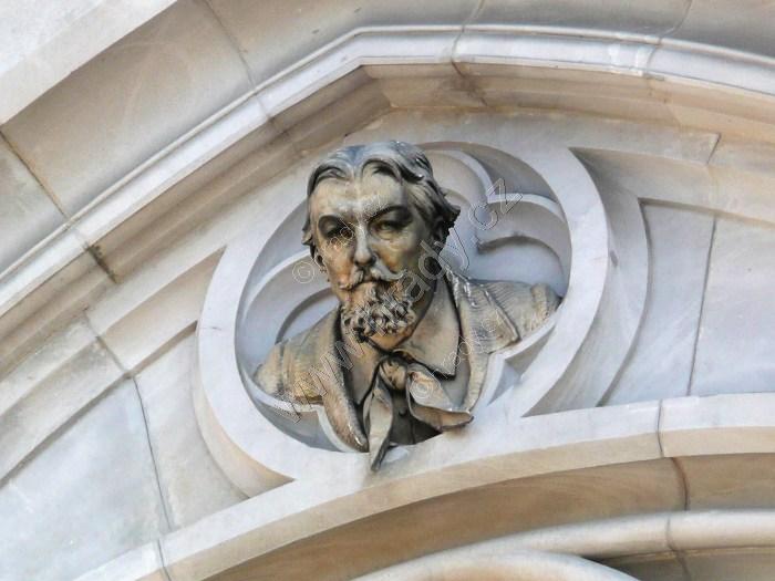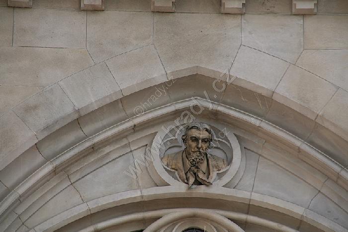 Portrétní busta architekta Gustava Meretty v západním průčelí