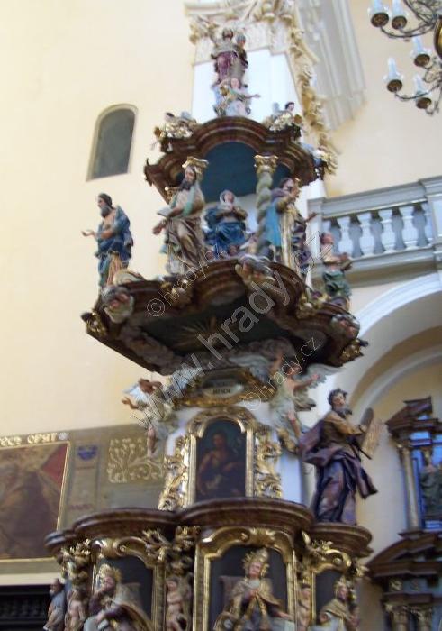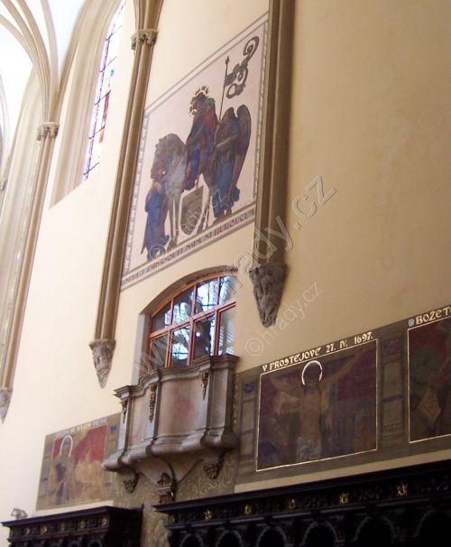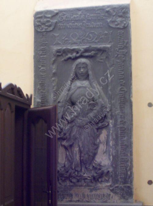 Nejcenější místo kostela. Náhrobek Johanky z Kravař s erbovními prvky.