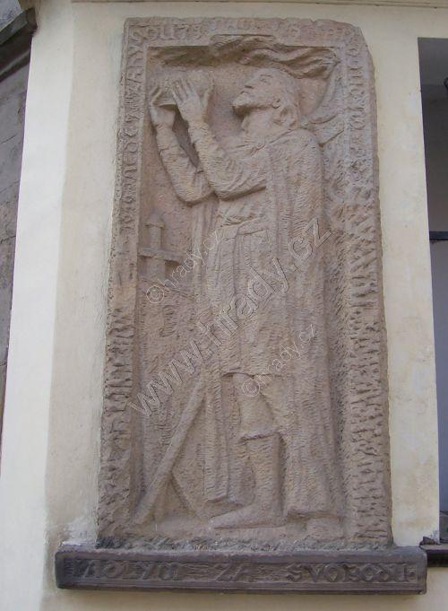 Výjev znázorňující sv. Václava na venkovní stěně chrámu.