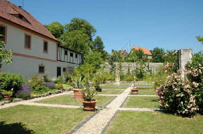 Zahrada biblických rostlin, v pozadí dům hostí sv. Hedviky