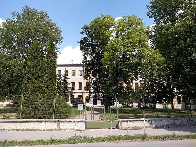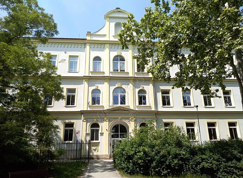 Pohled na školu z parku, bývalé zahrady.