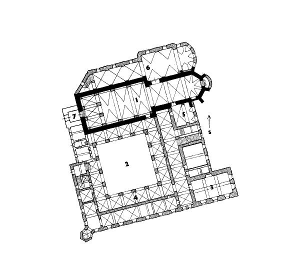 gotické zdivo černě, renesanční a barokní šrafovaně, ostatní klasicistní.