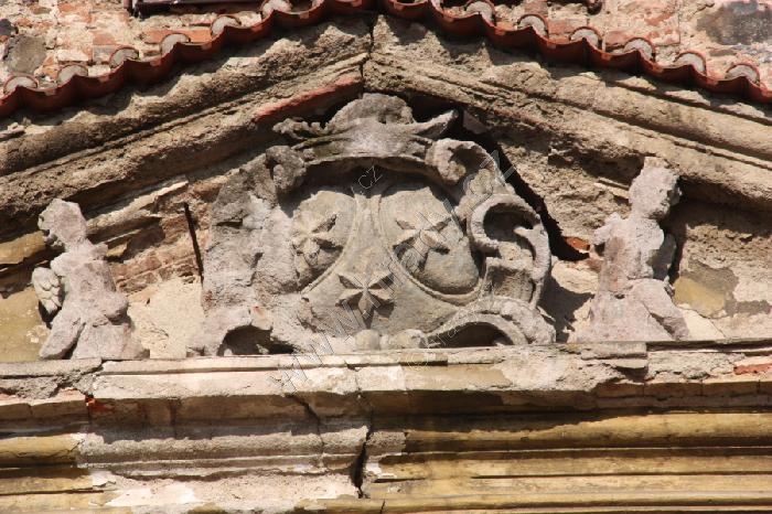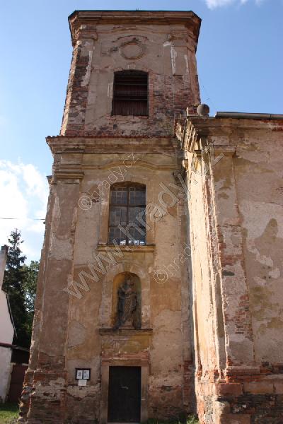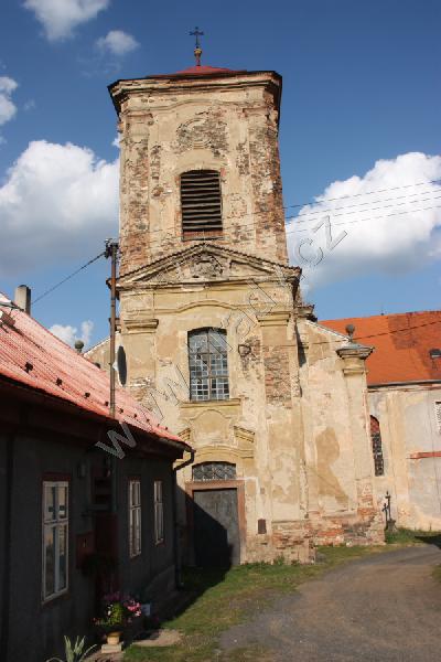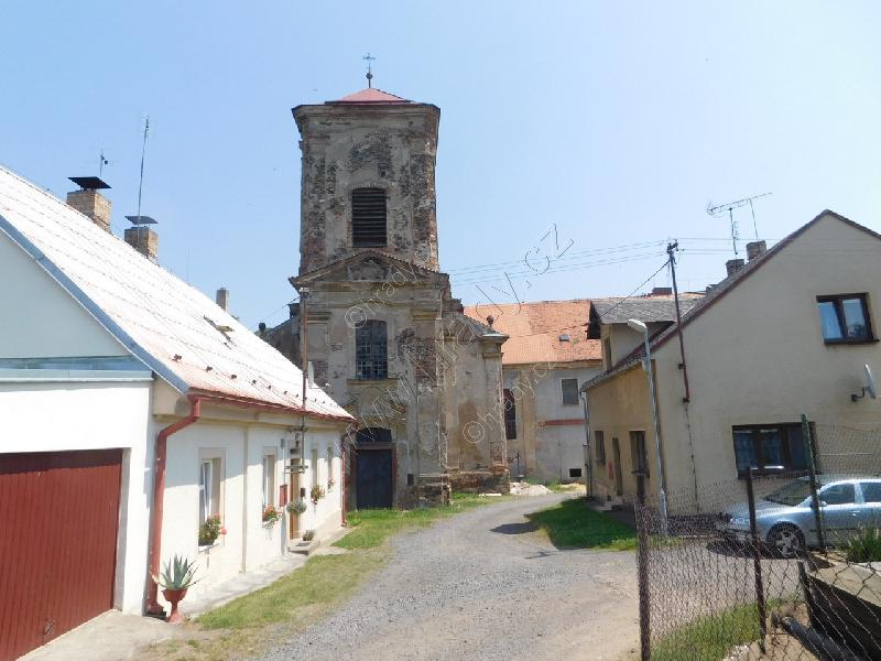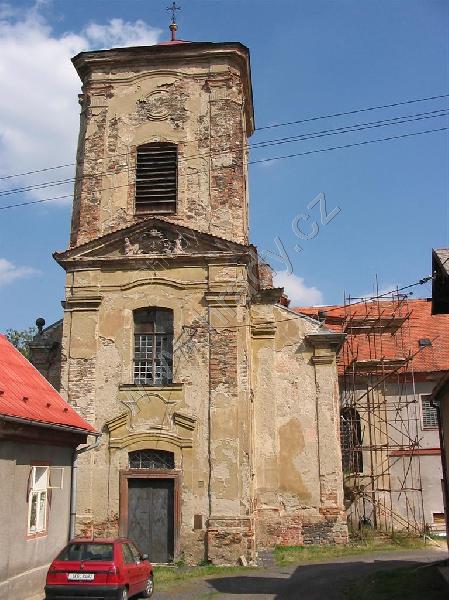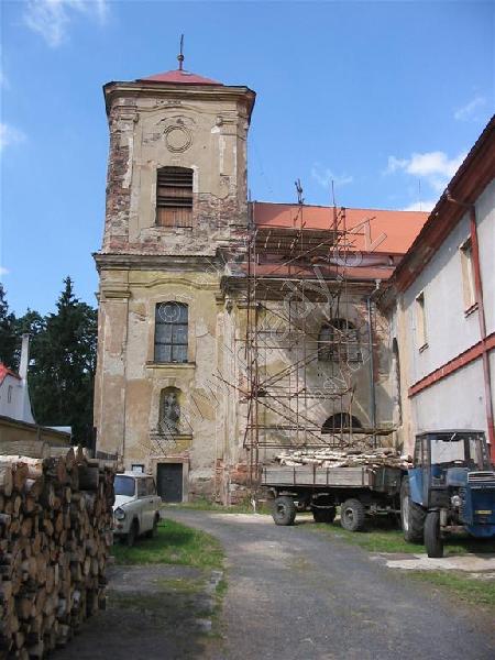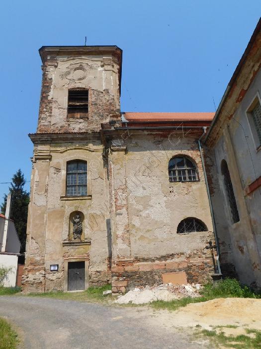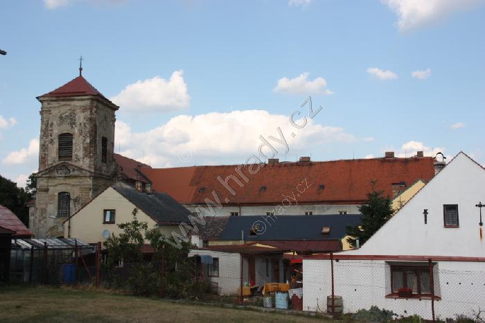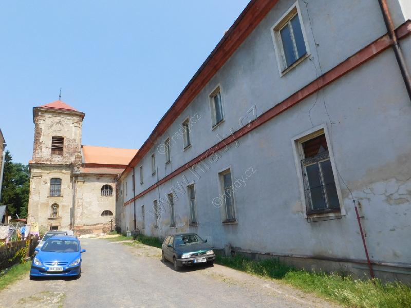 Kostel od západu, vlevo ruiny původního zámeckého pivovaru