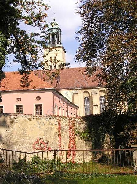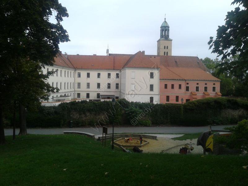 Pohled na kostel s klášterem z bývalého hradebního příkopu