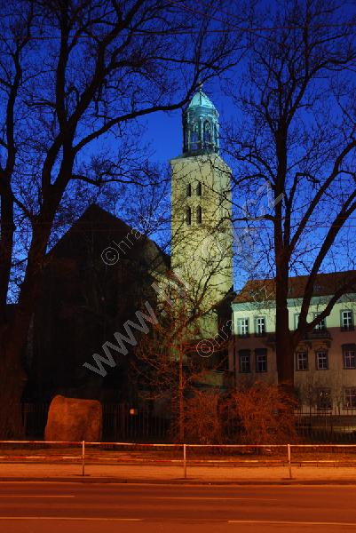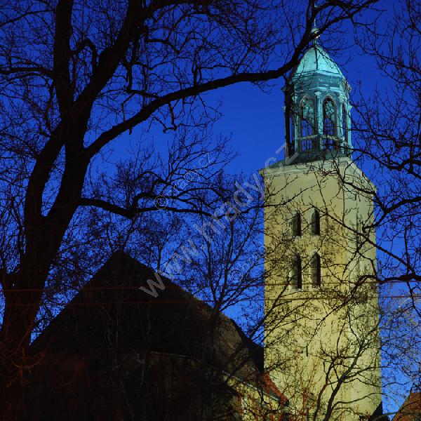 Pohled z Praskovy ulice na gotický závěr kostela a zvonici. V levo v popředí bludný balvan