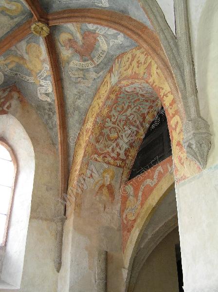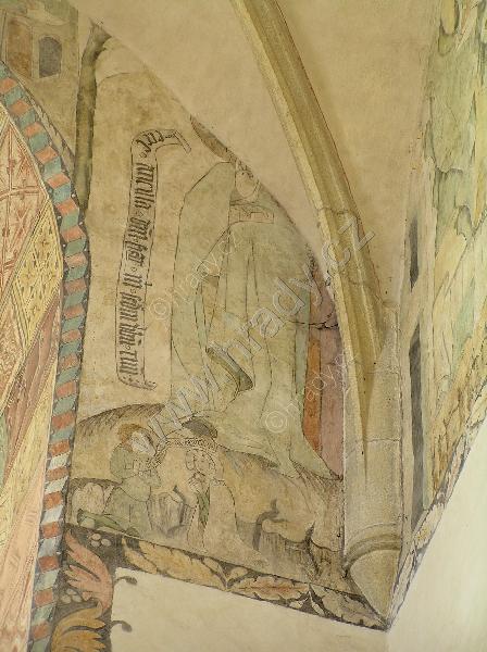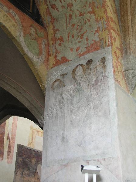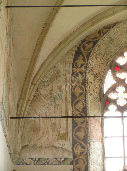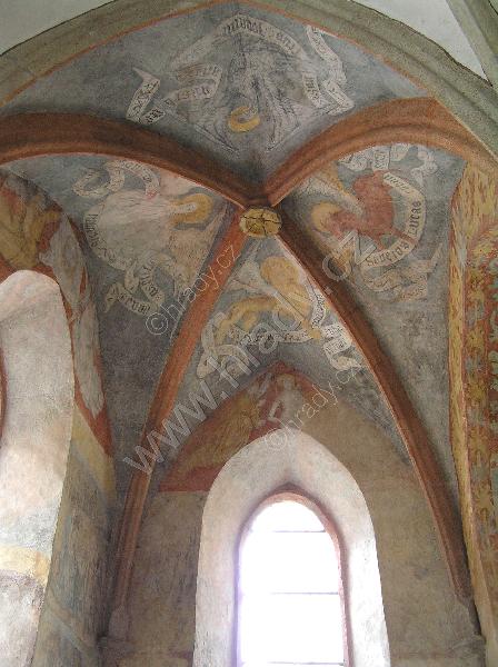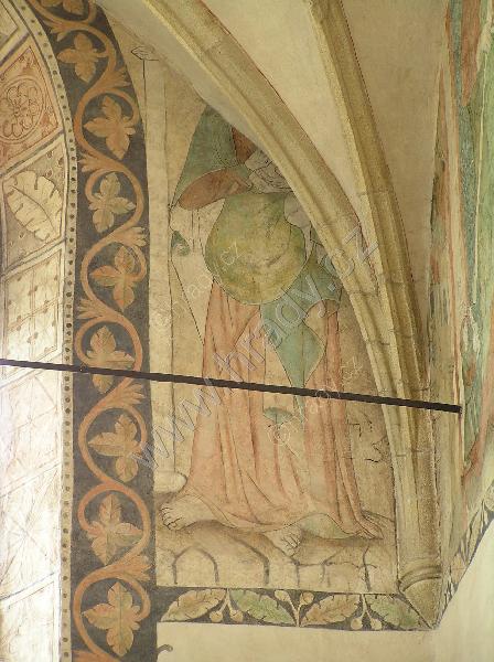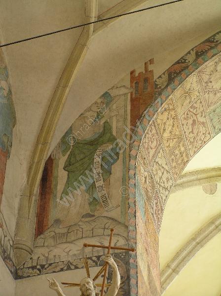 Malby apoštolů a architektury z doby kolem pol. 14. století byly částečně zakryty novou pozdně gotickou klenbou.