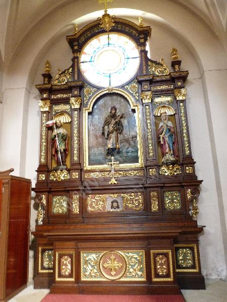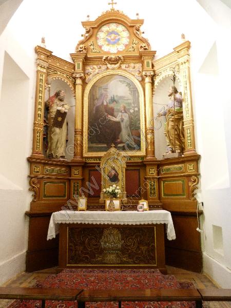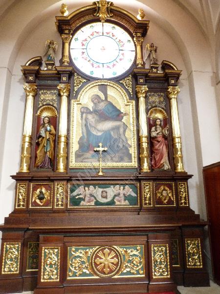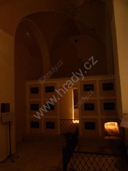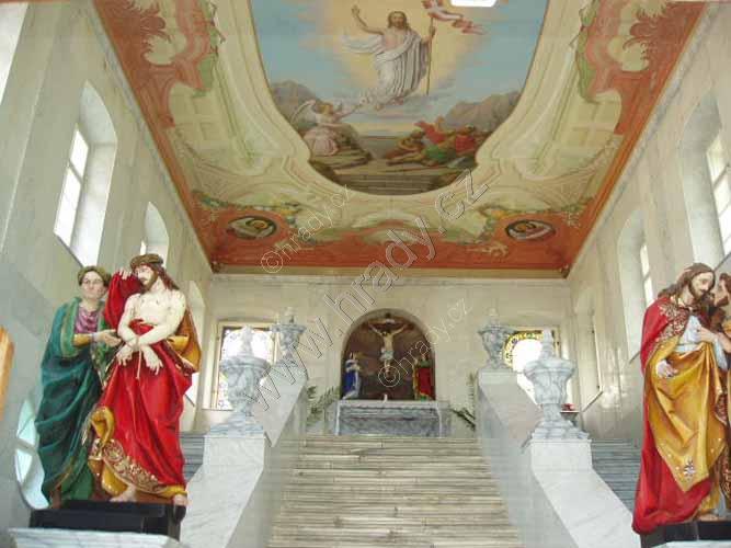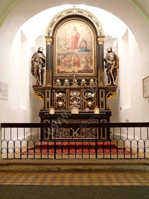 netradiční oltář s kostlivci v hale před vstupem do kostela