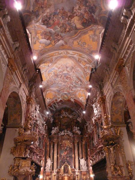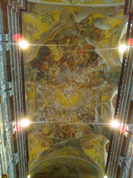 Obrázek z interiéru kostela zachycuje definitivní podobu kostela po zbourání Jezuitských kolejí kolem roku 1910