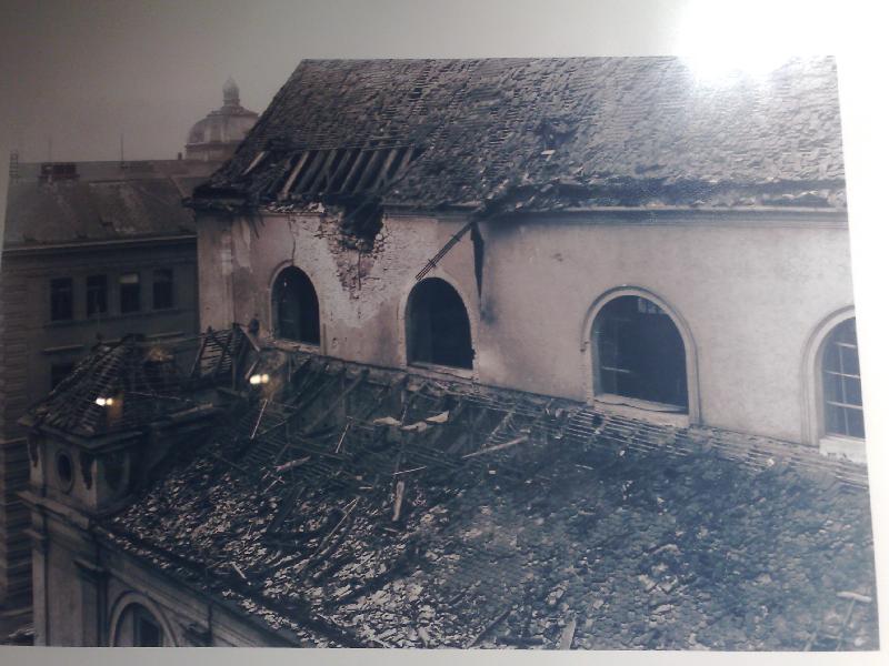 historická fotografie z kostela. Obrázek zachycuje zničenou střechu po náletech z 2.světové války
