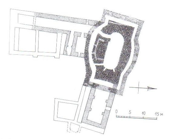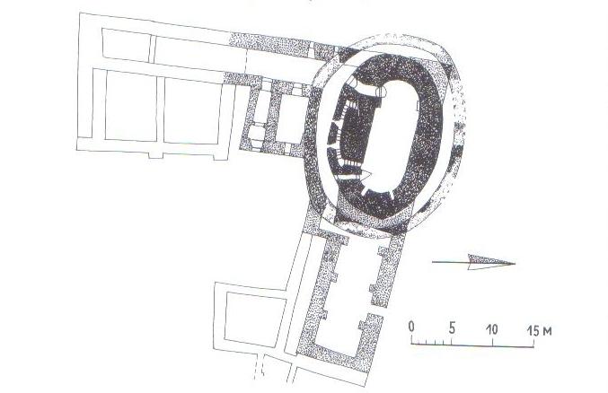 První stavební fáze objektu možného oválného hradu pod dnešní kaplí Božího těla v areálu jezuitského konviktu.