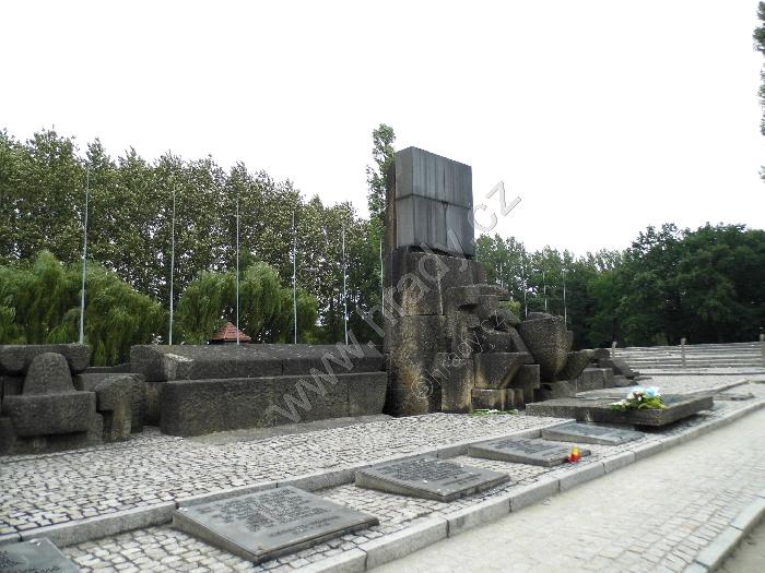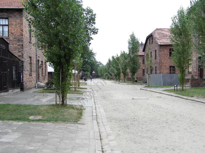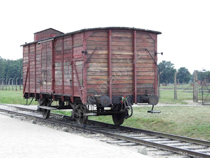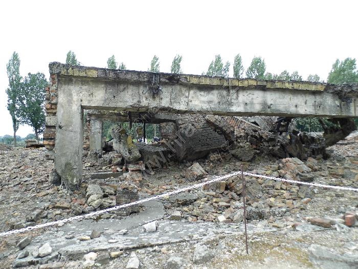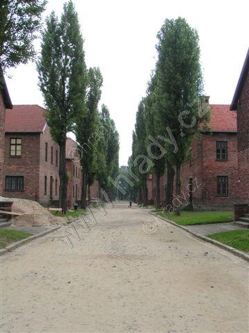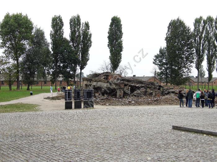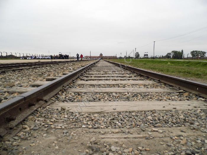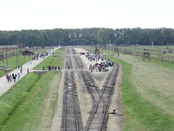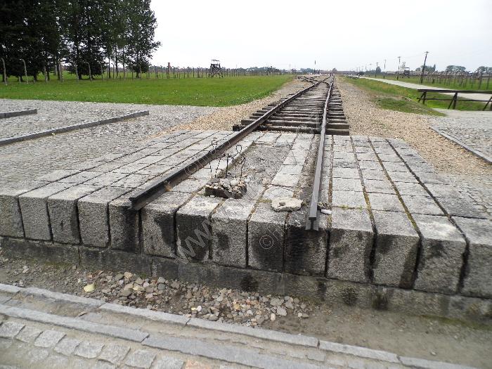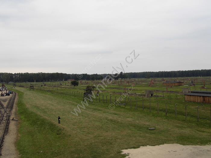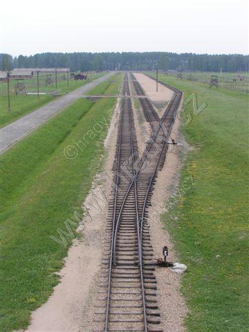 Rampa, na kterou přijížděly transporty. Vzadu u stromů již čekaly plynové komory.