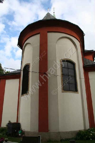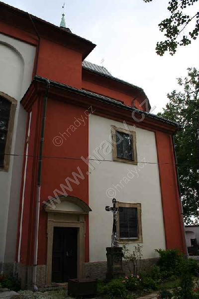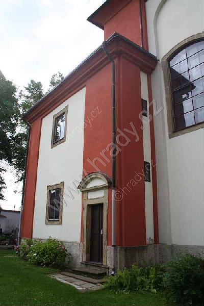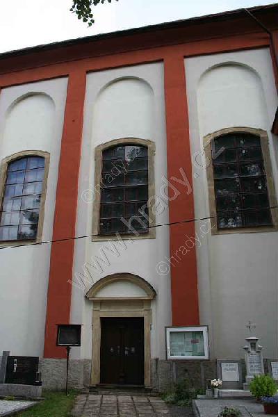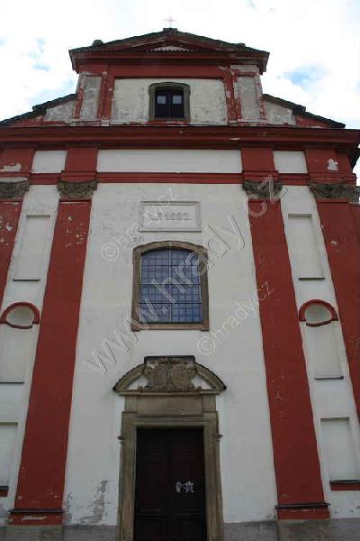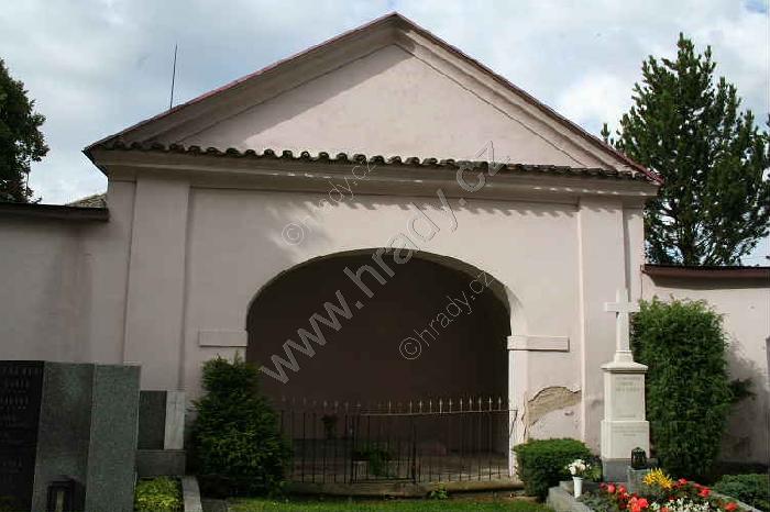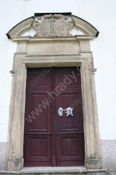 Západní portál s aliančním erbem Trautmannsdorfů a Černínů