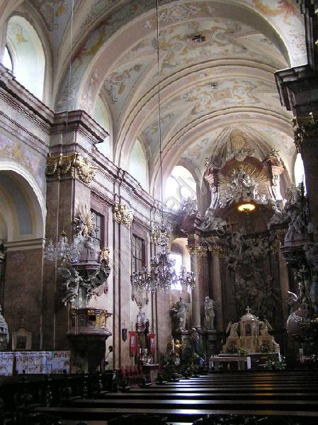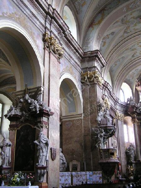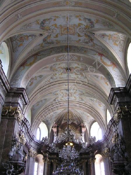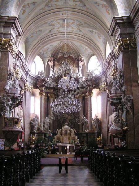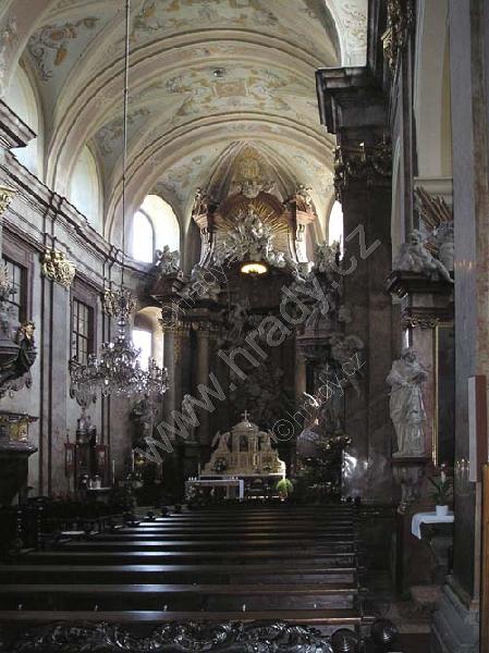 průhled hlavní lodí kostela ke hlavnímu oltáři