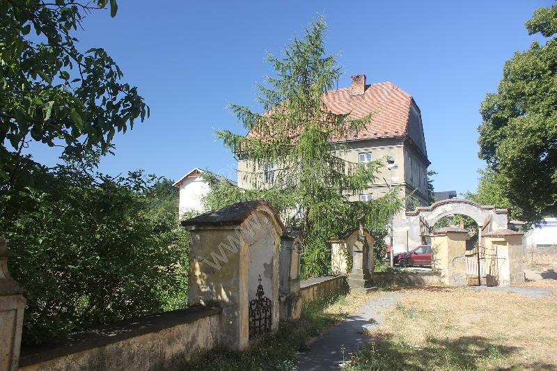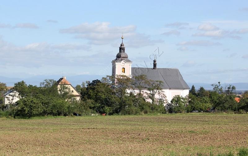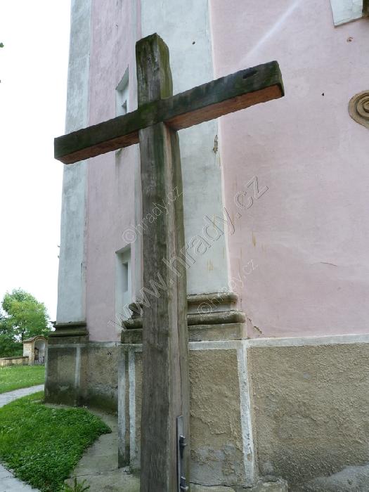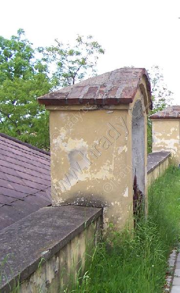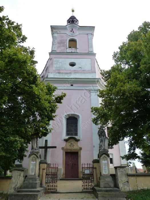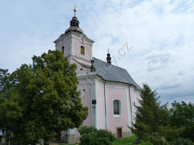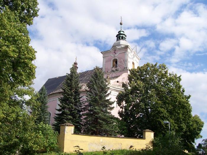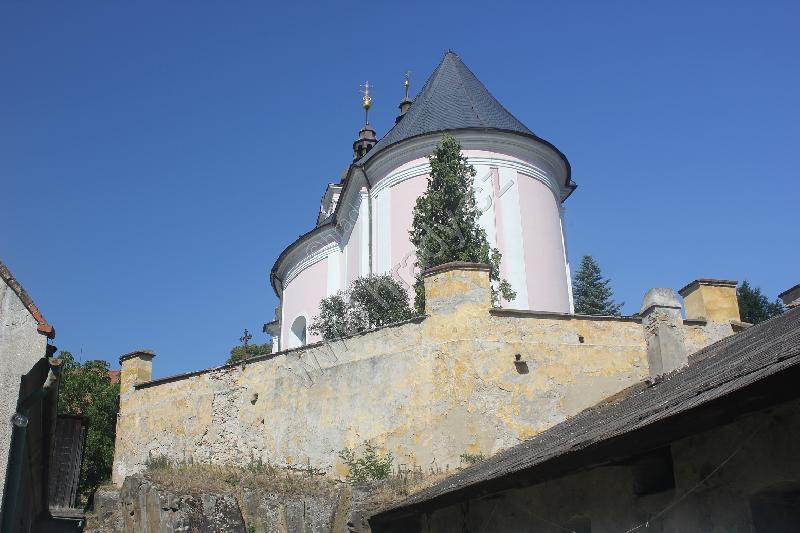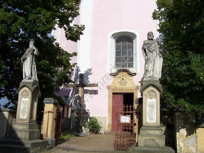 Pohled na kostel ohrazený hřbitovní zídkou.