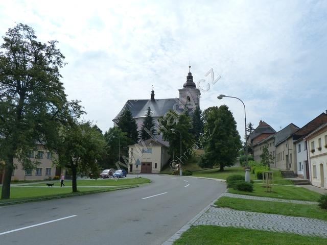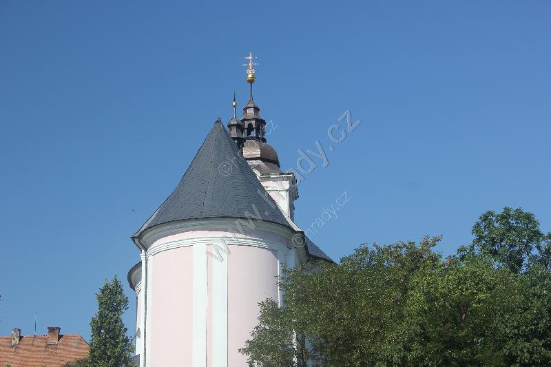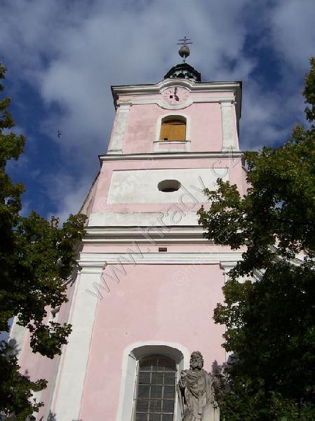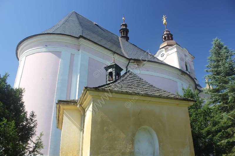 Pohled na kostel z centra obce, kde leží hlavní lázeňský komplex.