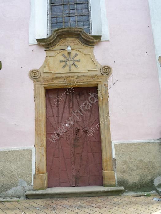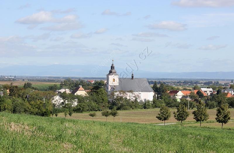 Vstup do kostela Nanebevzetí Panny Marie lemují sochy moravských patronů, sv. Cyrila a Metoděje.