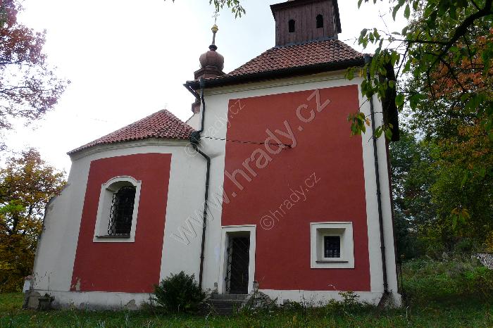 pohled od východu na presbytář se zachovaným opěrákem a hranolovou věž s vchodem do sakristie
