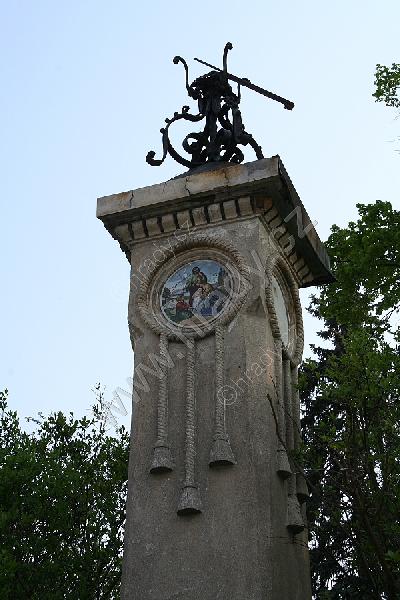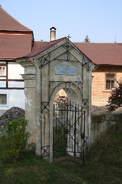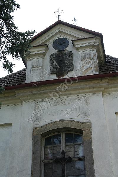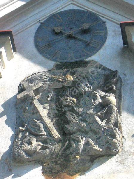 Horní část západního průčelí s reliéfem Trojice a datovou kartuší