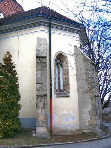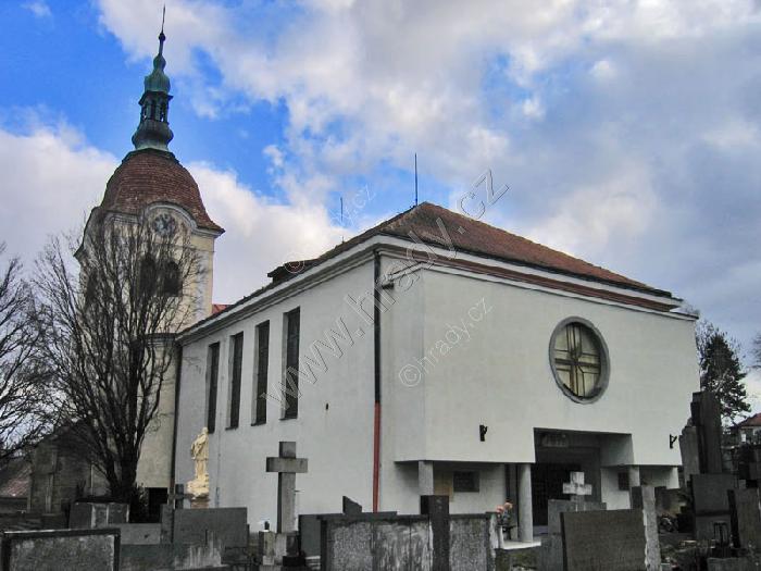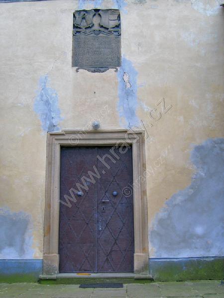Boční vchod do kostel s kamenným erbem Zoubků ze Zličína