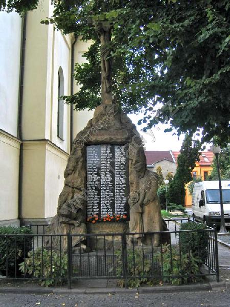 Před kostelm vystavěný pomník padlých v první svět. válce.