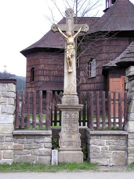 kamenný kříž s ukřižovaným Kristem před vstupem do areálu kostela a hřbitova