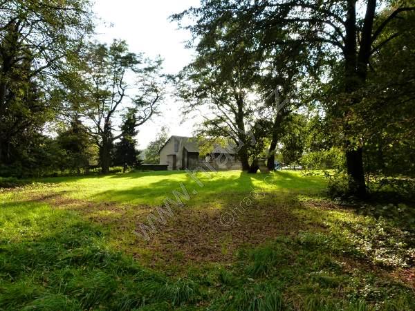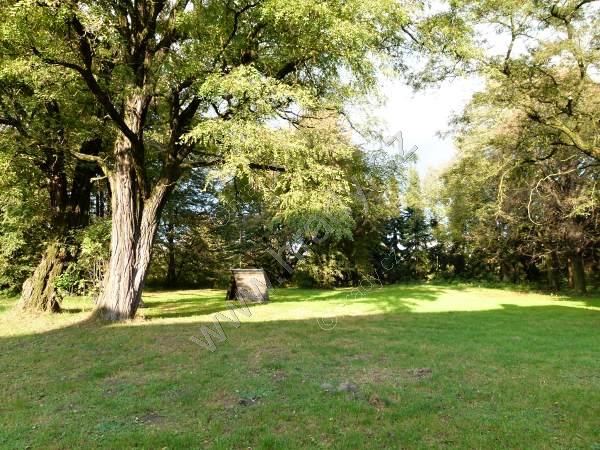 celkový pohled přes plochu zaniklého hřbitova a kostela k západu na objekt bývalého fojtství v pozadí