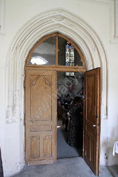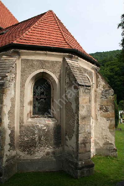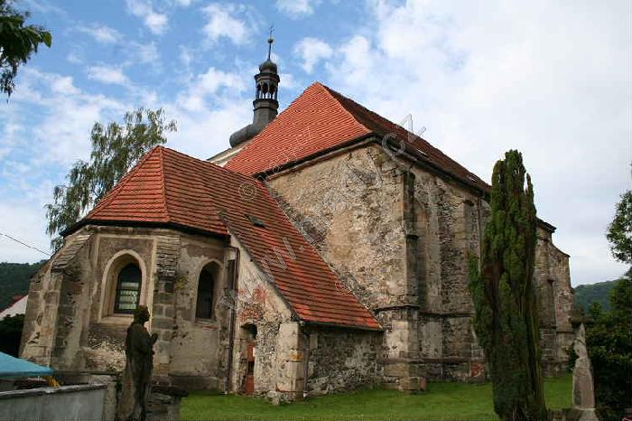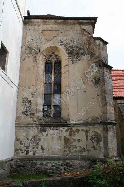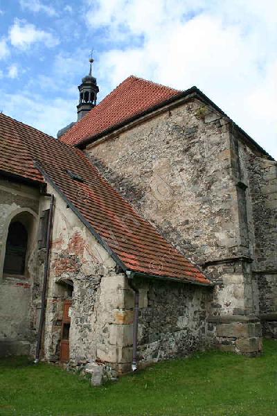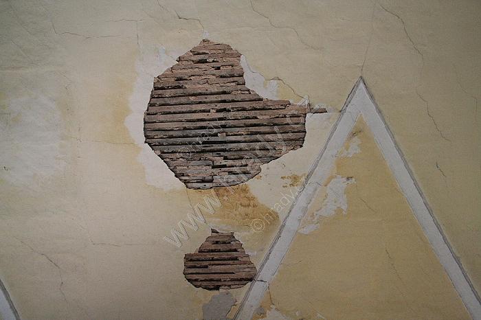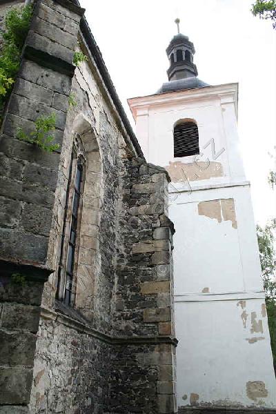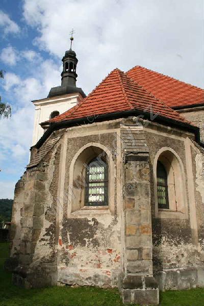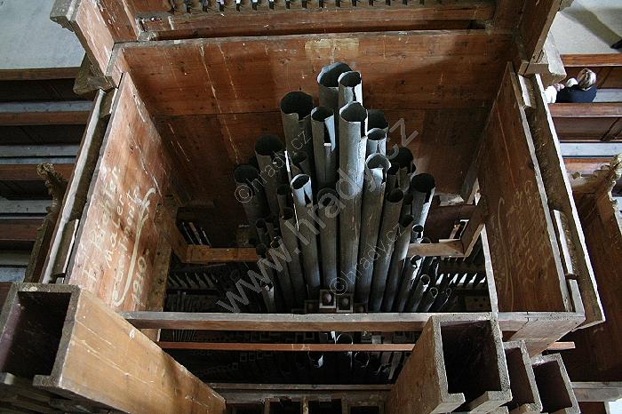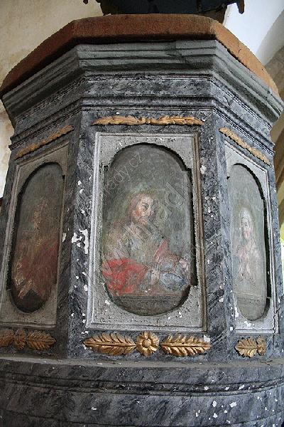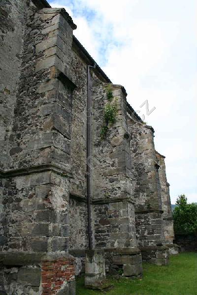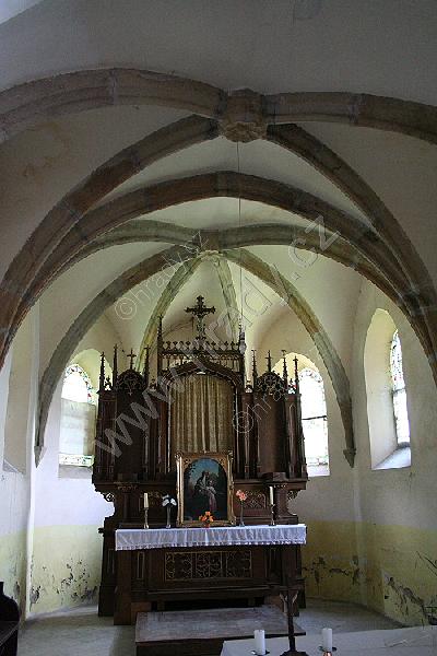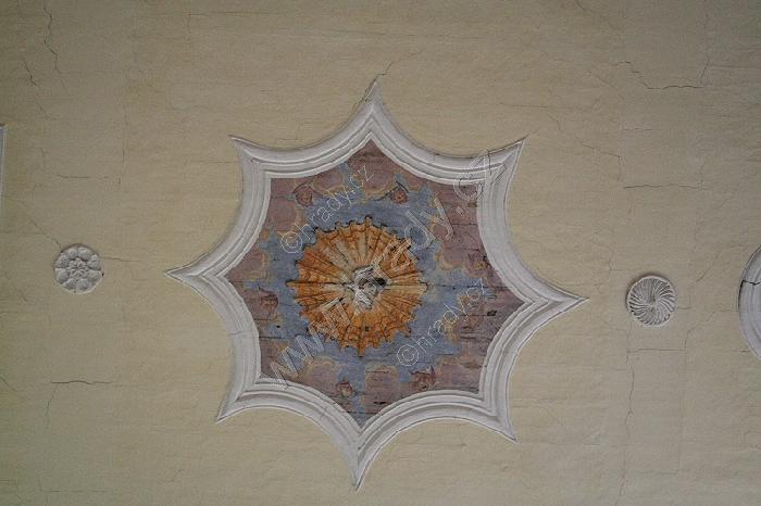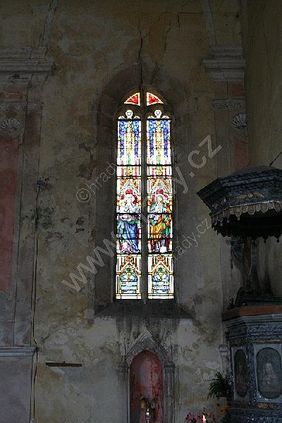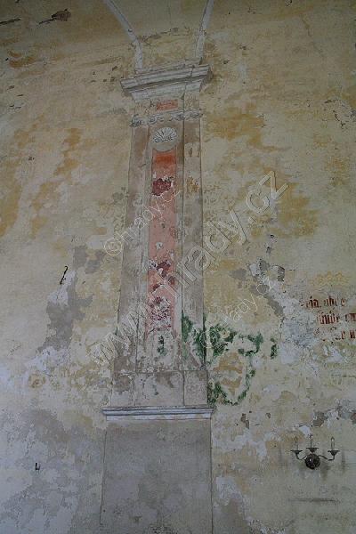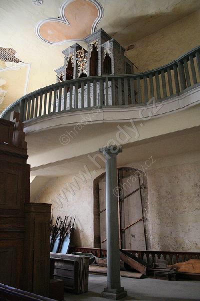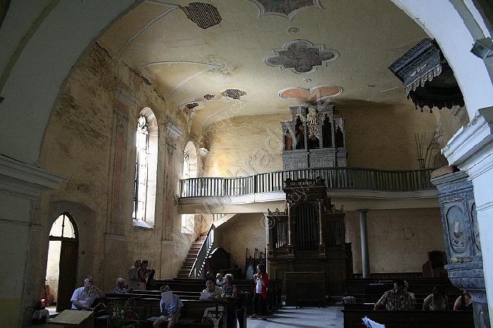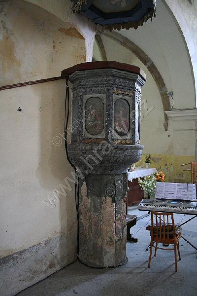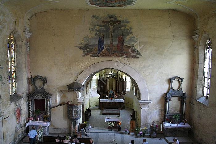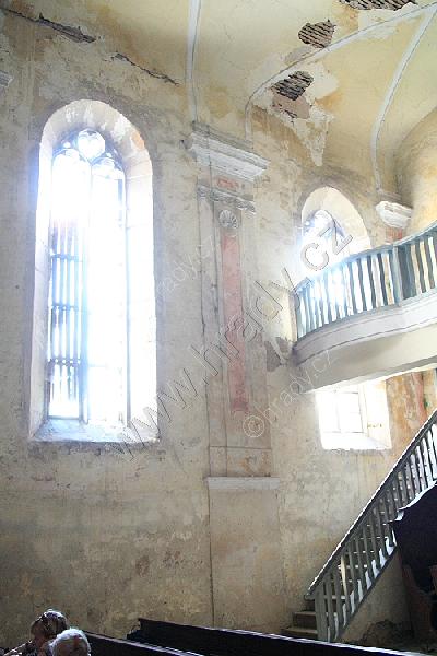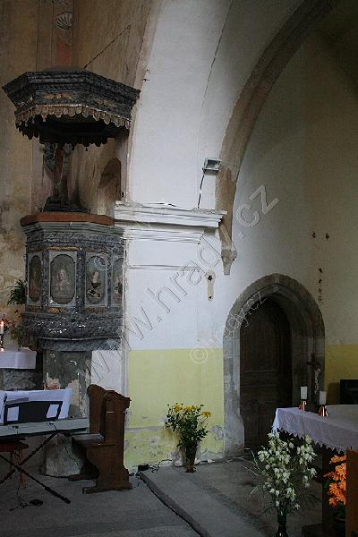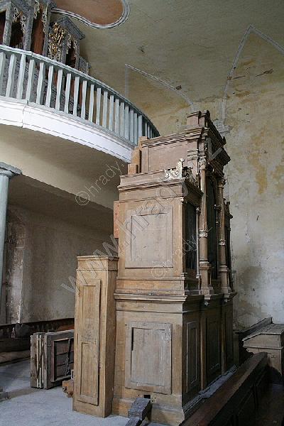 Východní stěna lodi s vítězným obloukem, kazatelnou a torsy bočních oltářů