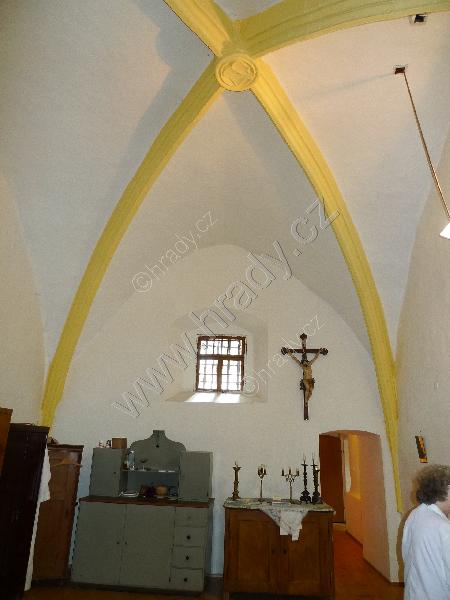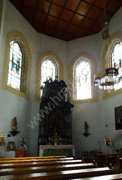 Zazděný vítězný oblouk, směřující původně do prostoru kostelní lodi.
