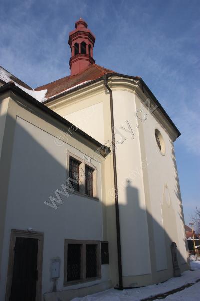 Kostel od západu, z uličky od Horního náměstí