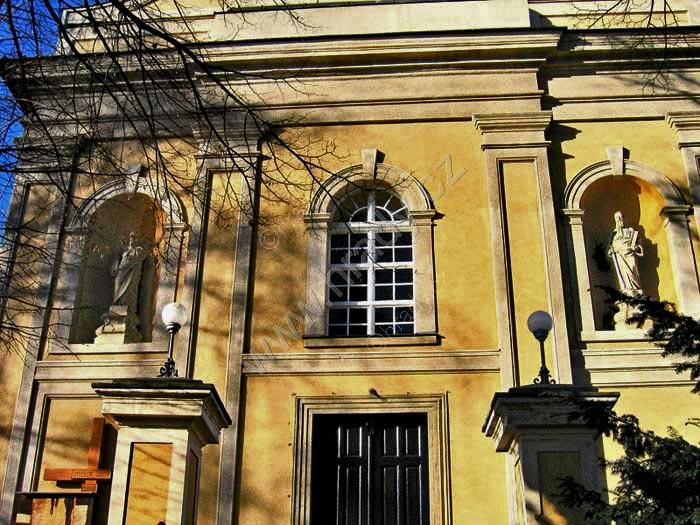 Průčelí kostela se sochami sv. Cyrila a Metoděje