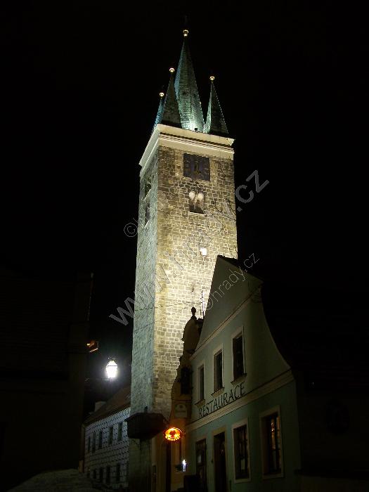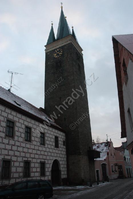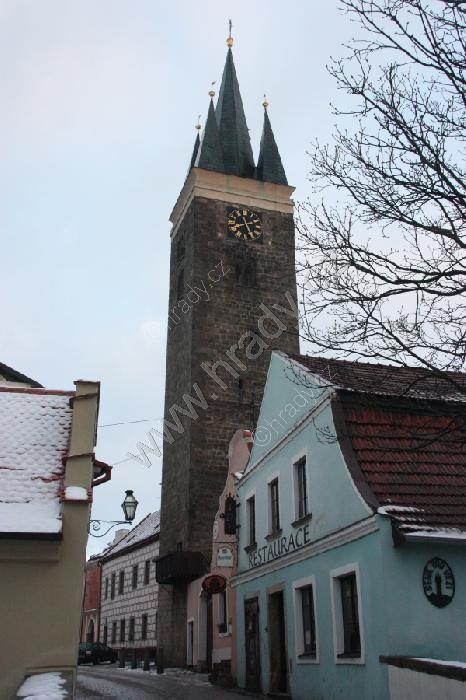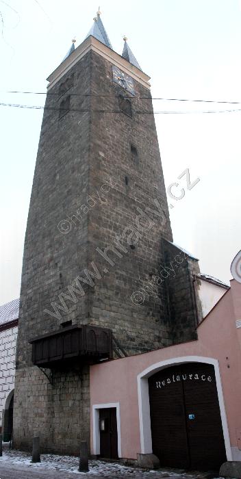 Věž kostela z Palackého ulice (od někdejší vnitřní Velké brány)