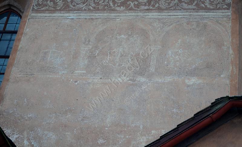 Již špatně čitelné erby, které jsou součástí sgrafitové výzdoby.
