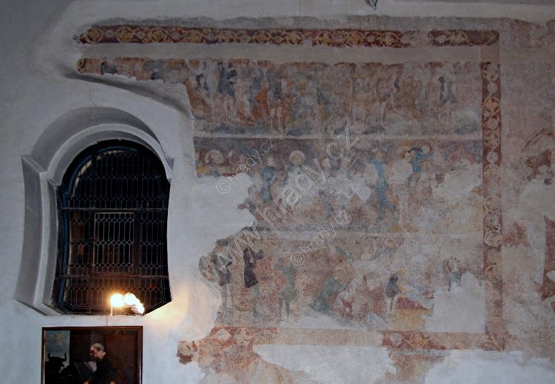 nástěnná malba, tři pásy z legendy o neznámé světici na severní stěně lodi