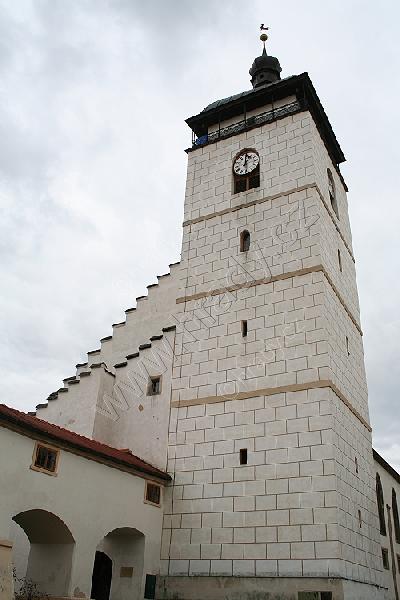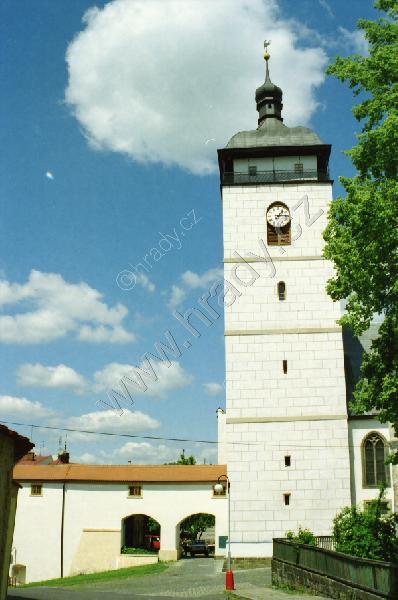 Kostelní věž a spojovací chodba do sousedního zámku od jihu