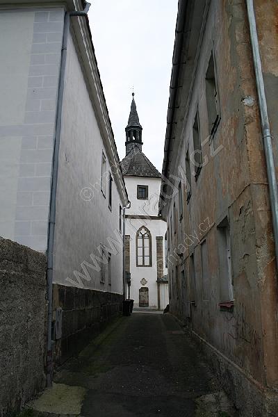 Průhled k závěru kostela mezi děkanstvím (vlevo) a starou školou