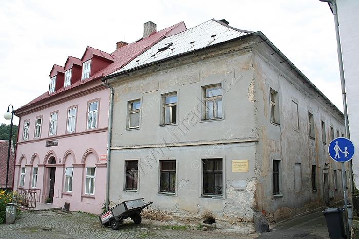 Stará škola, nad okny patra nápisová deska z roku 1583