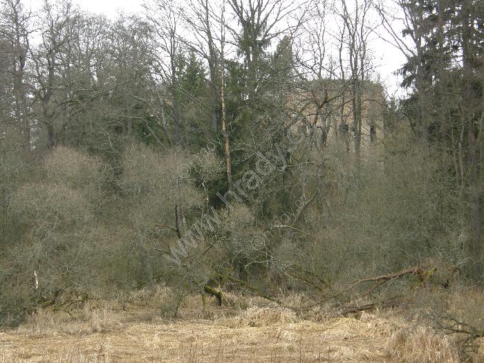 Na střeše bývalého kostela dnes rostou již poměrně velké stromy.