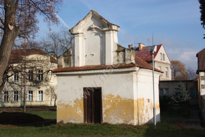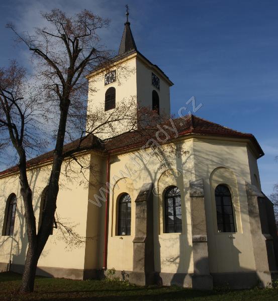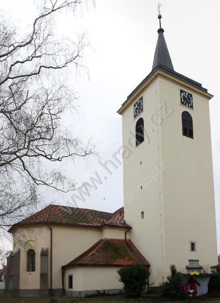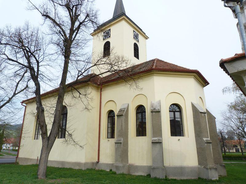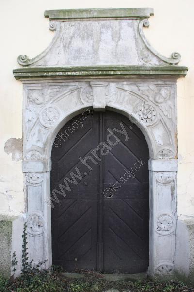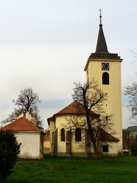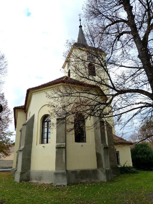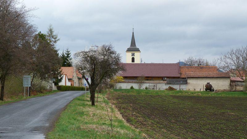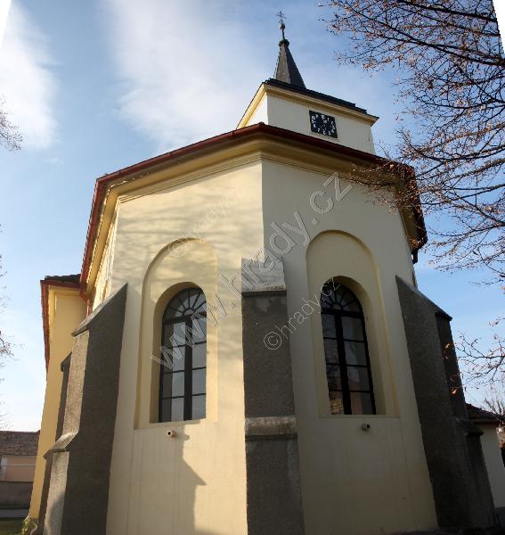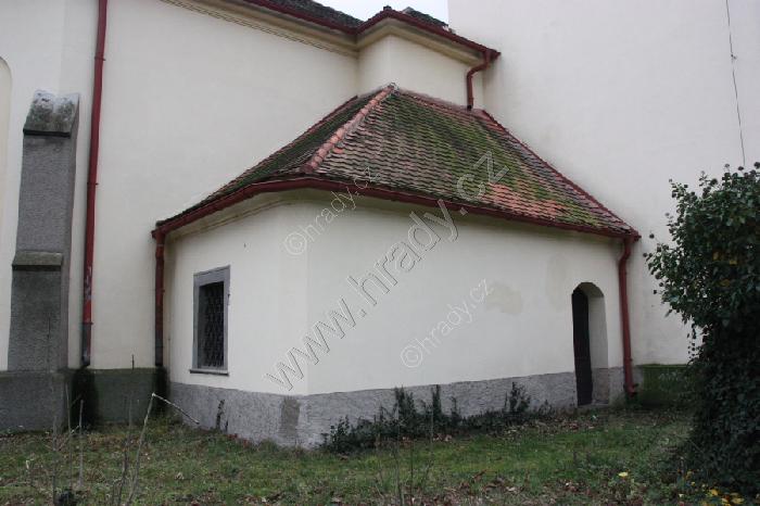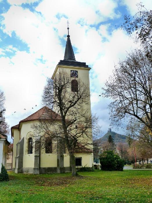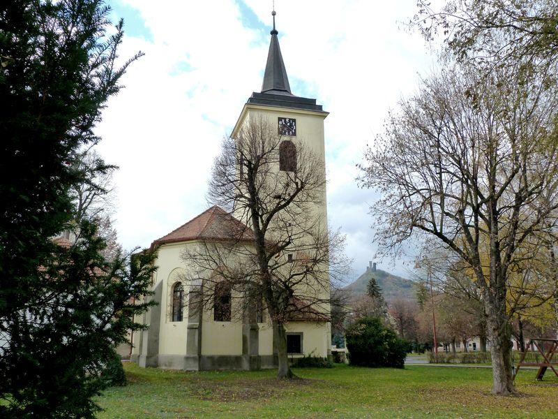 Kostel a márnice od východu, vpravo v pozadí Hazmburk