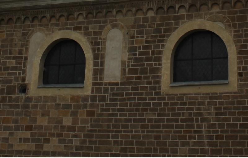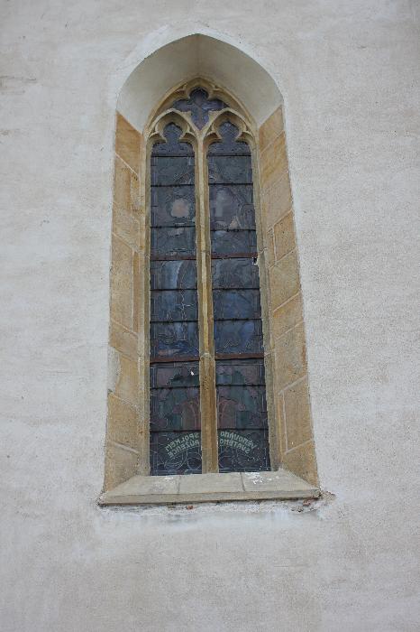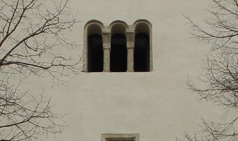 sdružená románská okna z původní věže druhotně osazené v gotické věži z 2. pol. 15. stol.