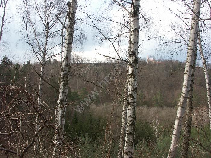 ostrožna hradiště s kostelem ze silnice na Kaninu