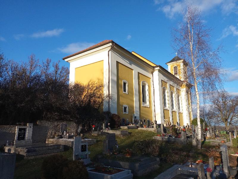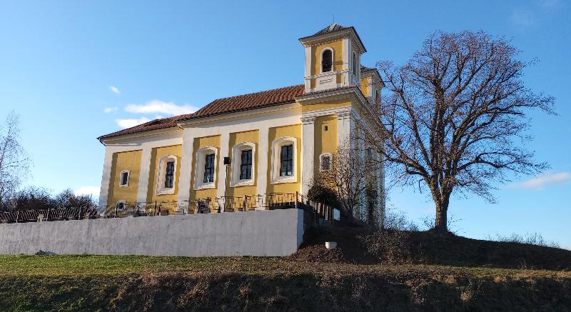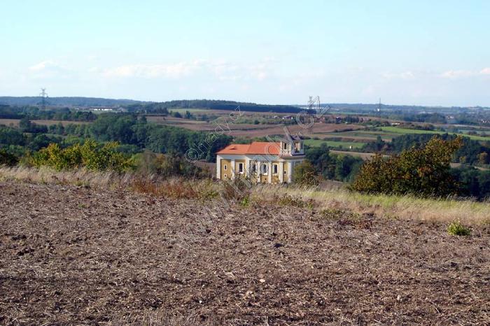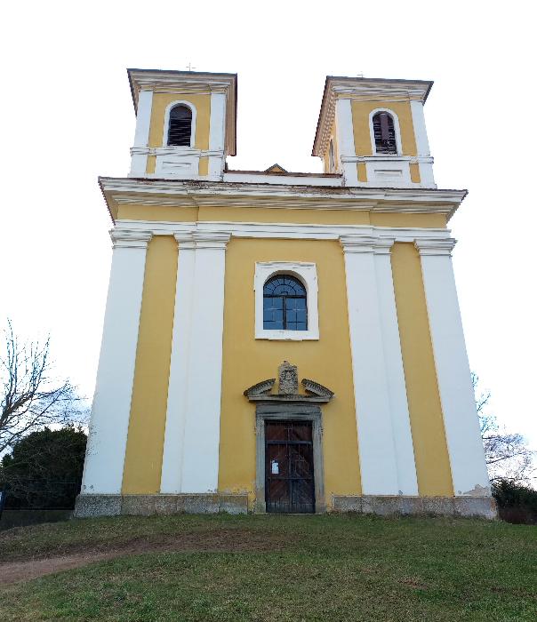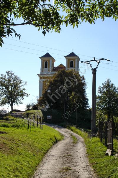 Kostel sv. Kateřiny ze silnice z Chotče do Třebotova