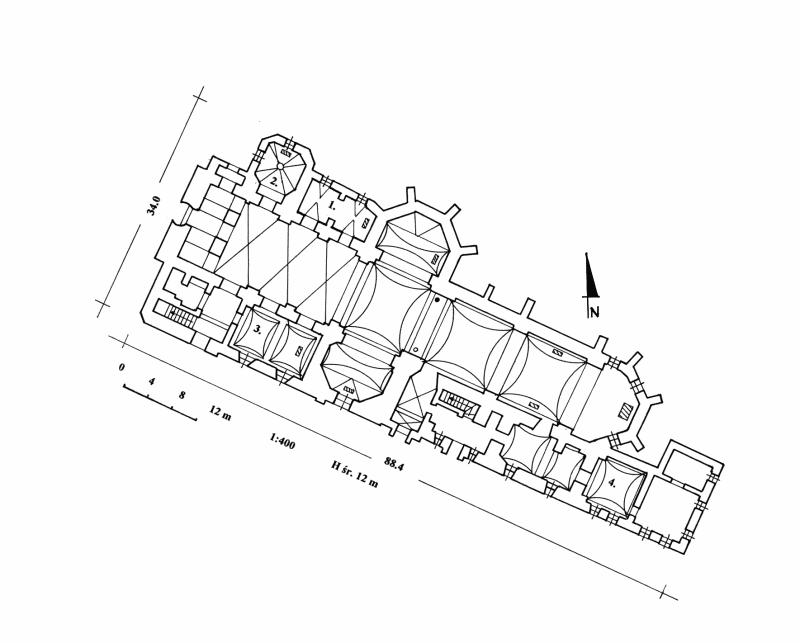 Pohled na novější zástavbou částečně zakrytý presbytář chrámu