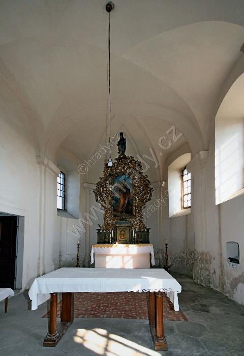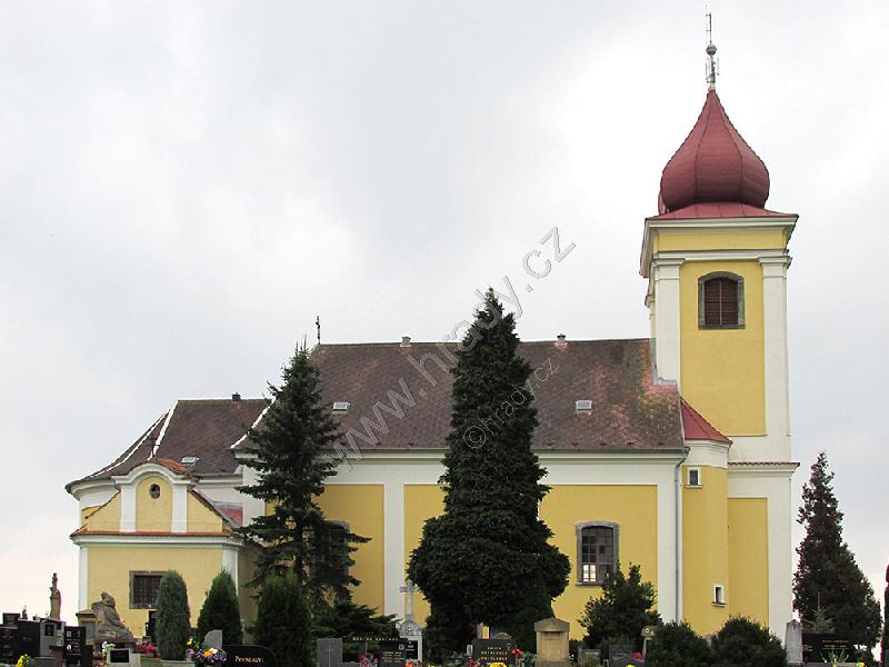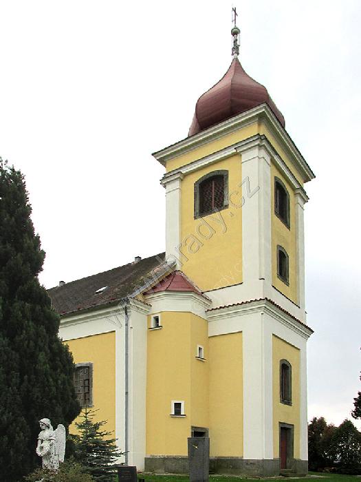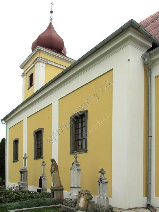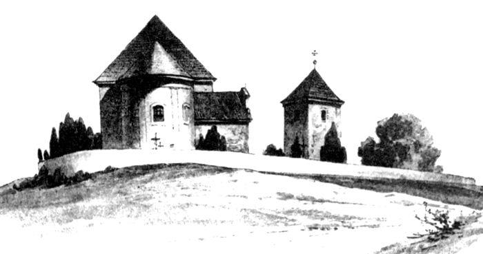 kostel se zvonicí od východu v 19. století na kresbě K. Liebschera