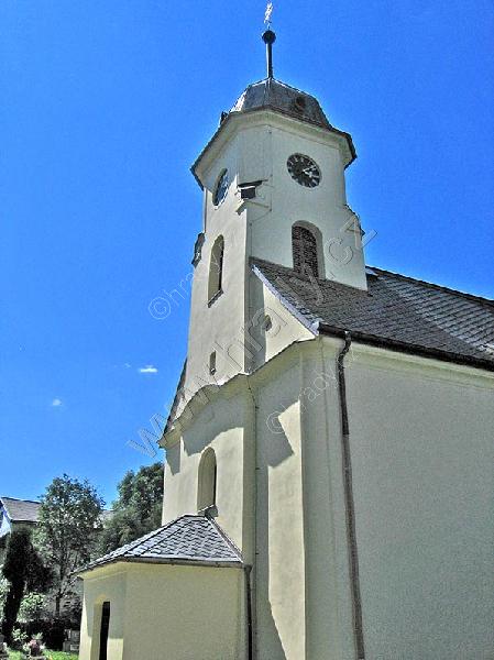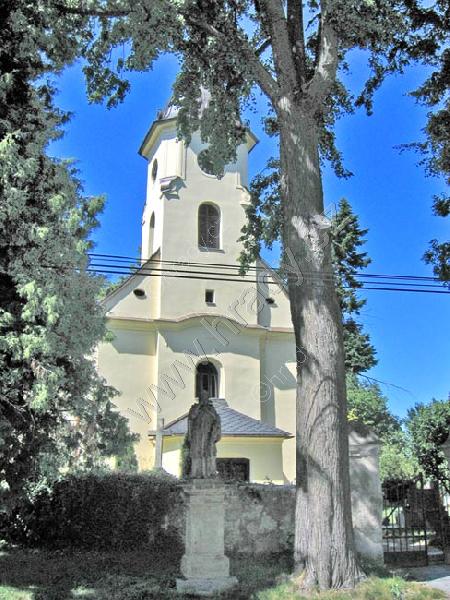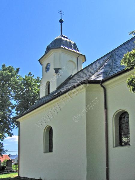 Pohled na kostel od jihu. V popředí socha sv. Jana Nepomuckého.