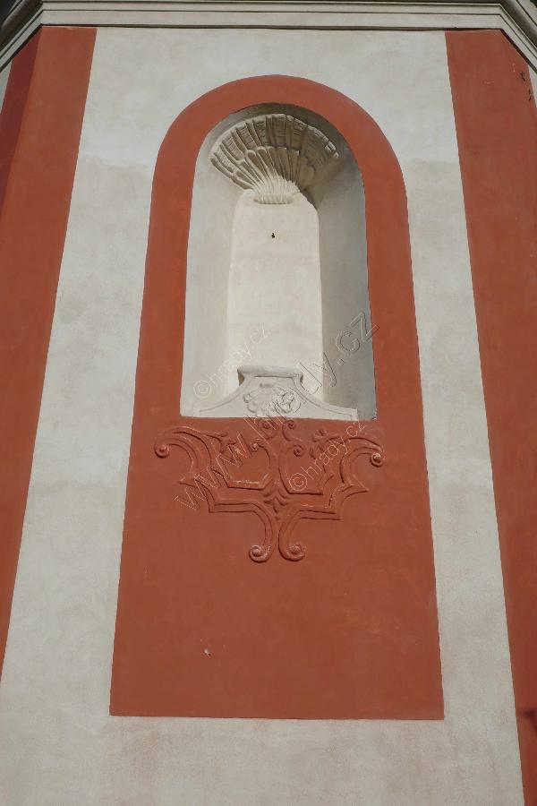 V exteriéru jihovýchodní části závěru je půlkruhově zaklenutá nika s podstavcem pro sochu světce.