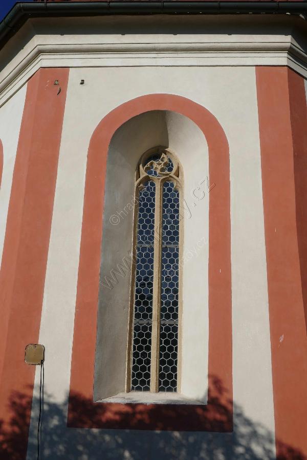 Zapuštěné východní gotické okno presbytáře má kamenné ostění s kružbou.
