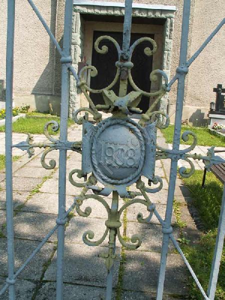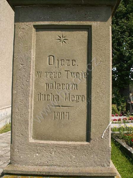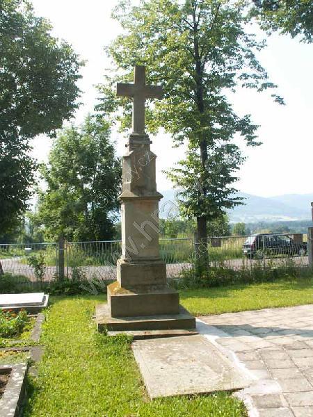 Celkový pohled na zadní stranu kříže pod nímž je náhrobní deska nesoucí kněžský znak (nápis na této náhrobní desce je vlivem poškození špatně čitelný)